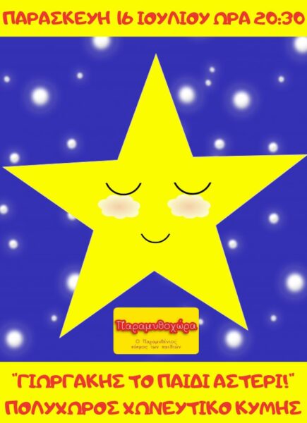 * Λόγω των μέτρων προστασίας από τον Covid – 19 οι καλοκαιρινές παραστάσεις της Παραμυθοχώρας, θα πραγματοποιηθούν με τη σκηνή σε απόσταση κάποιων μέτρων από τους μικρούς θεατές. Τα διαδραστικά κομμάτια της παράστασης θα πραγματοποιούνται τηρώντας τις απαραίτητες αποστάσεις και όλα τα μέτρα που συνιστά το υπουργείο υγείας. Παρακαλούνται οι γονείς όπως διευκολύνουν την ορθή διεξαγωγή της εκδήλωσης