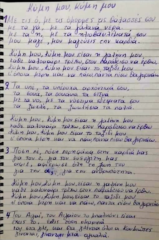Αφού λοιπόν ολοκλήρωσε τους στίχους αυτού του τόσο ιδιαίτερου τραγουδιού επικοινώνησε με τον Γιώργο Πηλιχο, ένα υπέροχο και ταλαντούχο παιδί που είναι από τον τόπο μας και έτσι ξεκίνησε το λυρικό ταξίδι που έμελλε να δώσει ζωή σε αυτό το τόσο ιδιαίτερο τραγούδι που εξυμνεί τις ομορφιές της αγαπημένης μας Κύμης.