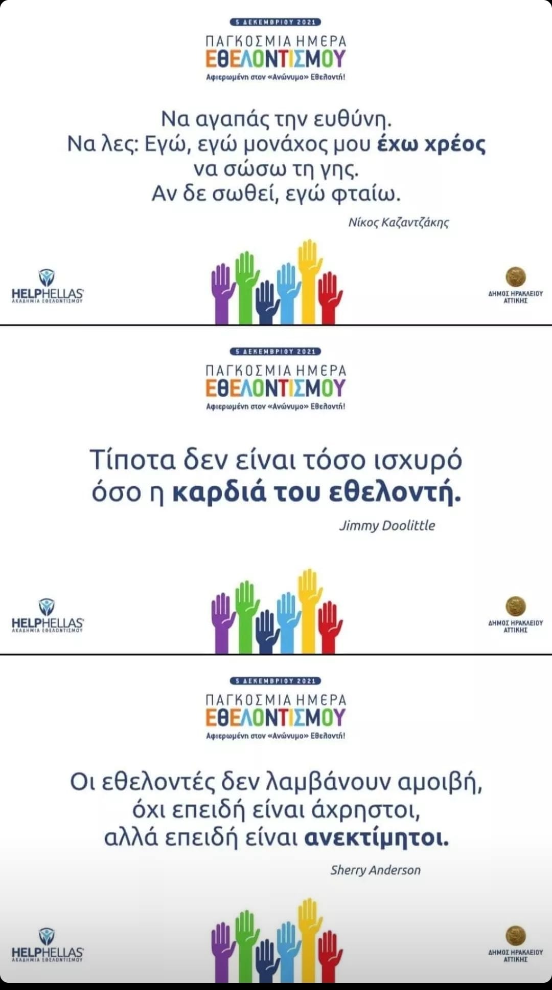 H σημερινή ημέρα είναι αφιερωμένη στους εθελοντές και στο έργο που προσφέρουν καθημερινά, διαθέτοντας χρόνο, επιστημονικές γνώσεις, εργασία, φαντασία, κόπο και δημιουργικότητα σε μια οργανωμένη προσπάθεια με σκοπό να συμβάλλουν ενεργά στην καλυτέρευση της κοινωνίας.