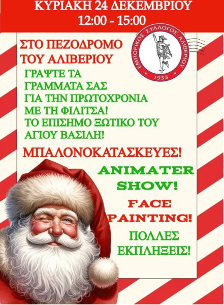 Την Κυριακή 24 Δεκεμβρίου 12:00 – 15:00 στο αγαπημένο Αλιβέρι θα βρίσκεται η Φιλίτσα, το επίσημο ξωτικό του Άγιου Βασίλη. Ελάτε να γράψετε μαζί της τα γράμματα σας για την Πρωτοχρονιά, να διασκεδάσετε με face painting, animater show, μπαλονοκατασκευες και πολλες πολλες εκπληξεις! Σας περιμενουμε!