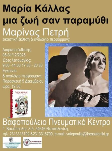 «Μαρία Κάλλας μια ζωή σαν παραμύθι» είναι ο τίτλος της πολιτιστικής εκδήλωσης που οργανώνει το Βαφοπούλειο Πνευματικό Κέντρο με μια μεγάλη εικαστική έκθεση στα δύο φουαγιέ και αναλόγιο περφόρμανς της Μυκονιάτισσας ζωγράφο και συγγραφέα Μαρίνα Πετρή. Το αναλόγιο περφόρμανς θα γίνουν στο αμφιθέατρο, κατά την διάρκεια των εγκαίνιων της έκθεσης την Παρασκευή 5 Δεκεμβρίου 2025, ώρα: 19:30.