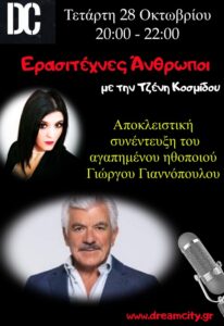 Την Τετάρτη 28 Οκτωβρίου 20:00 – 22:00 ο Γιώργος Γιαννόπουλος μιλάει αποκλειστικά στην Τζένη Κοσμίδου και στην εκπομπή «Ερασιτέχνες Άνθρωποι» στον μαγικό Dreamcity Web Radio σε μια αποκλειστική συνέντευξη εφ’ όλης της ύλης!