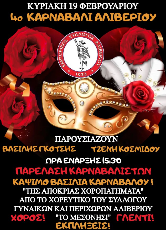Το Σάββατο 18 και τη Κυριακή 19 Φεβρουαρίου ο Εμπορικός Σύλλογος Αλιβερίου μας χαρίζει ένα μοναδικό αποκριάτικο γλέντι! Χορεύουμε στους δρόμους, στα καταστήματα και στα μπαλκόνια μας!
