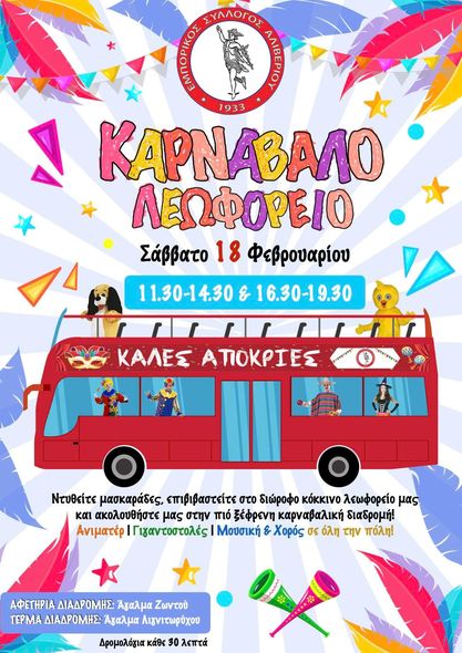 Το Σάββατο 18 Φεβρουαρίου βγάζει για μια και μοναδική αποκριάτικη βόλτα στους κεντρικούς και πολυσύχναστους δρόμους της πόλης μας ένα ΚΑΡΝΑΒΑΛΟ-ΛΕΩΦΟΡΕΙΟ!