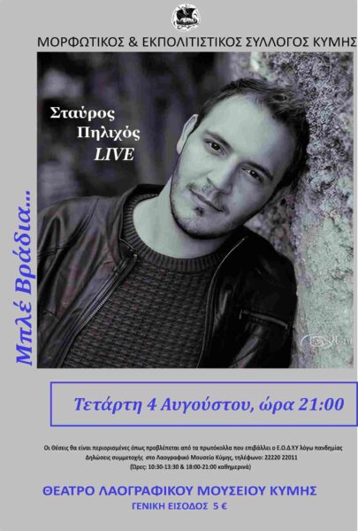 Σήμερα Τετάρτη 4 Αυγούστου στις 21:00 ο Μορφωτικός, Εκπολιτιστικός Σύλλογος Κύμης φέρνει στο Θέατρο του Λαογραφικού Μουσείου Κύμης τον Αλιβεριώτη Καλλιτέχνη Σταύρο Πηλιχό. Ο αγαπημένος μας καλλιτέχνης σε αυτό το τόσο ξεχωριστό Live θα μας χαρίσει για άλλη μια φορά στιγμές μουσικής μαγείας. Τίτλος αυτής της τόσο ξεχωριστής βραδιάς; “Μπλε Βράδια” όπως και η υπέροχη μπαλάντα που κυκλοφόρησε πρόσφατα από την Panik Oxygen.