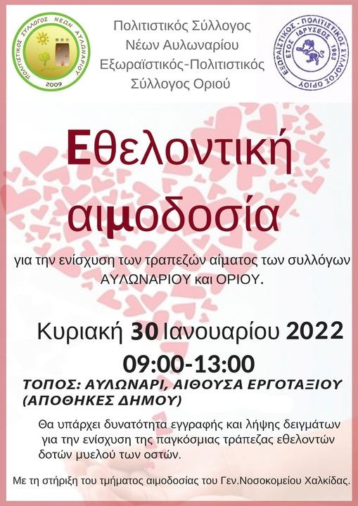 Ο Πολιτιστικός Σύλλογος Νέων Αυλωναρίου & ο Εξωραϊστικός – Πολιτιστικός Σύλλογος Οριού σας προσκαλούν στην εθελοντική αιμοδοσία στις 30 Ιανουαρίου 2022 από τις 9:00 εως τις 13:00 στην αίθουσα Εργοταξίου στο Αυλωνάρι.
