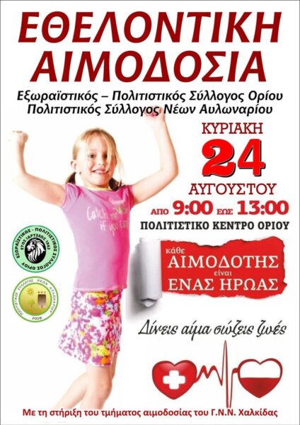 Σας προσκαλούμε να στηρίξετε την εθελοντική αιμοδοσία του Εξωραϊστικού Πολιτιστικού Συλλόγου Οριού και του Πολιτιστικού Συλλόγου Νέων Αυλωναρίου.