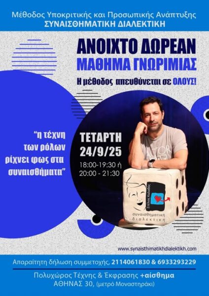 Ο ηθοποιός και σκηνοθέτης Στέλιος Καλαθάς, δημιουργός και εισηγητής της μεθόδου υποκριτικής και προσωπικής ανάπτυξης «Συναισθηματική Διαλεκτική»,που διδάσκει απο το 2004, προσκαλεί τους νέους φίλους που επιθυμούν μια πρώτη επαφή με την μέθοδο, στο ανοιχτό δωρεάν μάθημα γνωριμίας, Τετάρτη 24 Σεπτεμβρίου, ώρα 18:00 – 19:30 ή 20:00- 21:30 στον Πολυχώρο τέχνης & έκφρασης +αίσθημα, Αθηνάς 30, μετρό Μοναστηράκι. Απαραίτητη η δήλωση συμμετοχής στο 6933293229