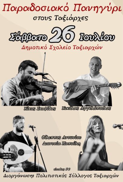 Ο Πολιτιστικός Σύλλογος Ταξιαρχών Κύμης σας προσκαλεί το Σάββατο 26 Ιουλίου στους Ταξιάρχες, για ένα πανηγύρι γεμάτο μουσική, χορό και διασκέδαση.